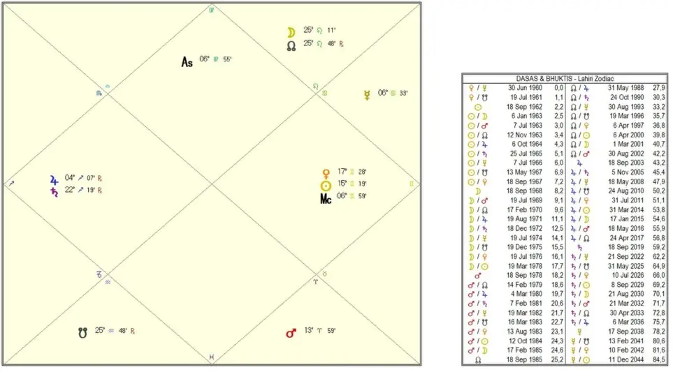 Grafik des Geburtshoroskops und Tabelle der Dasha-Lebensphasen nach der vedischen Astrologie. Planeten- und Häuserverteilungen, Herrscherplaneten der jeweiligen Lebensphasen. Beispiel siehe Produktseite.