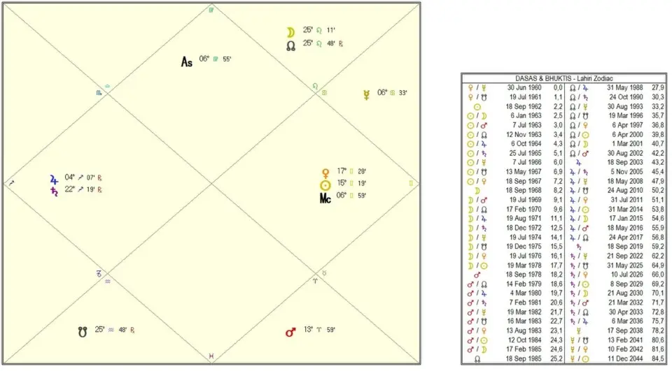 Grafik des Geburtshoroskops und Tabelle der Dasha-Lebensphasen nach der vedischen Astrologie. Planeten- und Häuserverteilungen, Herrscherplaneten der jeweiligen Lebensphasen. Beispiel siehe Produktseite.