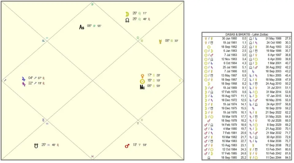Grafik des Geburtshoroskops und Tabelle der Dasha-Lebensphasen nach der vedischen Astrologie. Planeten- und Häuserverteilungen, Herrscherplaneten der jeweiligen Lebensphasen. Beispiel siehe Produktseite.